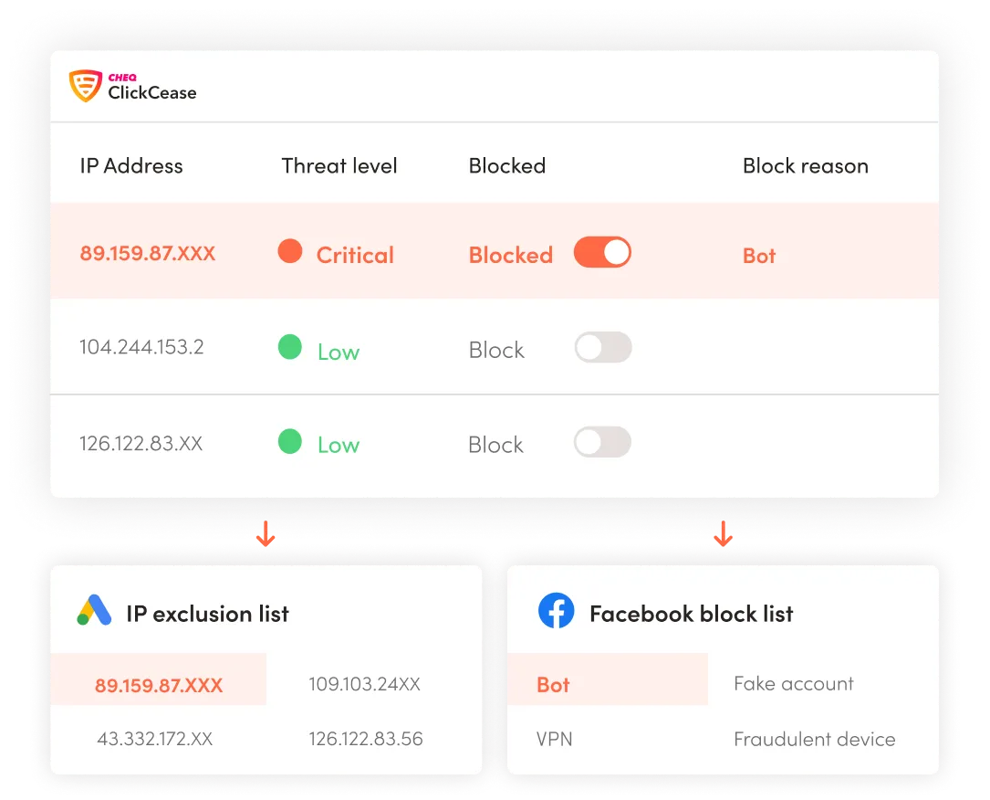 Fraudulent users are automatically and instantly blocked. Their IPs are sent to your Google Ads exclusion list and users are excluded on Meta Ads and Microsoft Ads, preventing them from engaging with your ads.