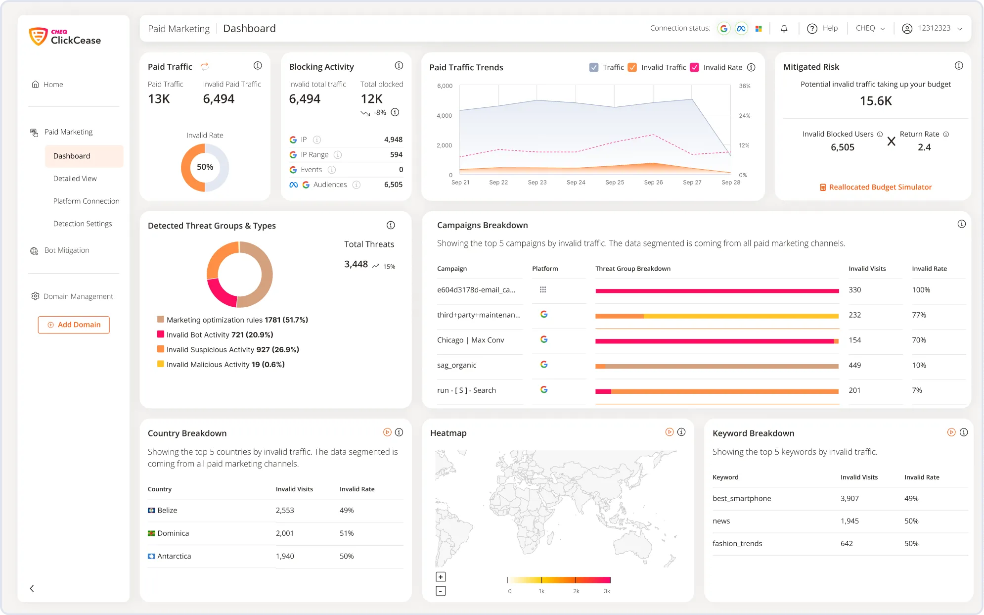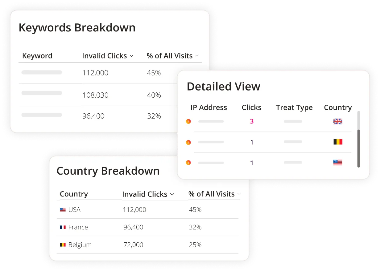 Our filters analyze every click on your Google, Meta or Bing Ads in real time. Block bad bots, click farms and other types of invalid traffic.